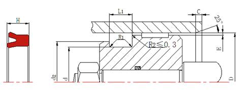 缸徑 D H9 | 溝槽底徑 d h9 | 槽寬 L1+0.2 | H | R1≤ | C≥ |